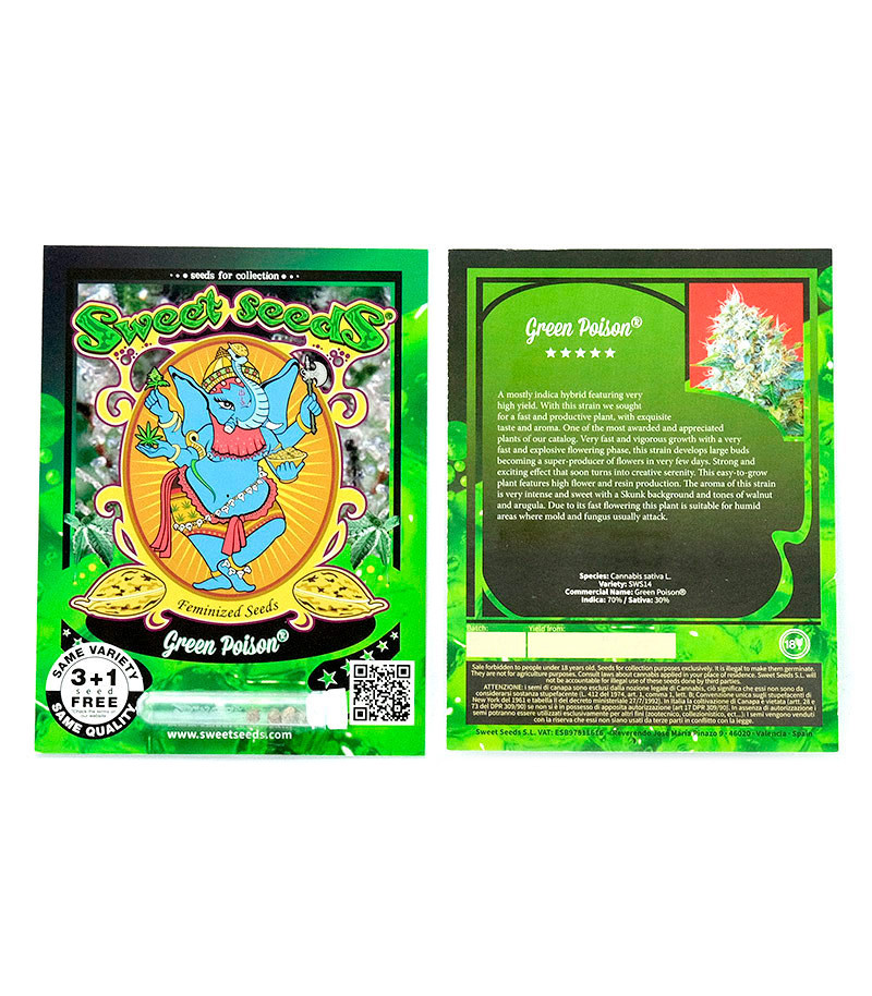 Генетика сорта Green Poison на 70% состоит из индики, на 30% - из сативы. Сорт выведен на основе уникального фенотипа растения индики, над которым тщательно работали селекционеры из Sweet Seeds. Их главной задачей было получить энергичное растение, производящее большие урожаи.