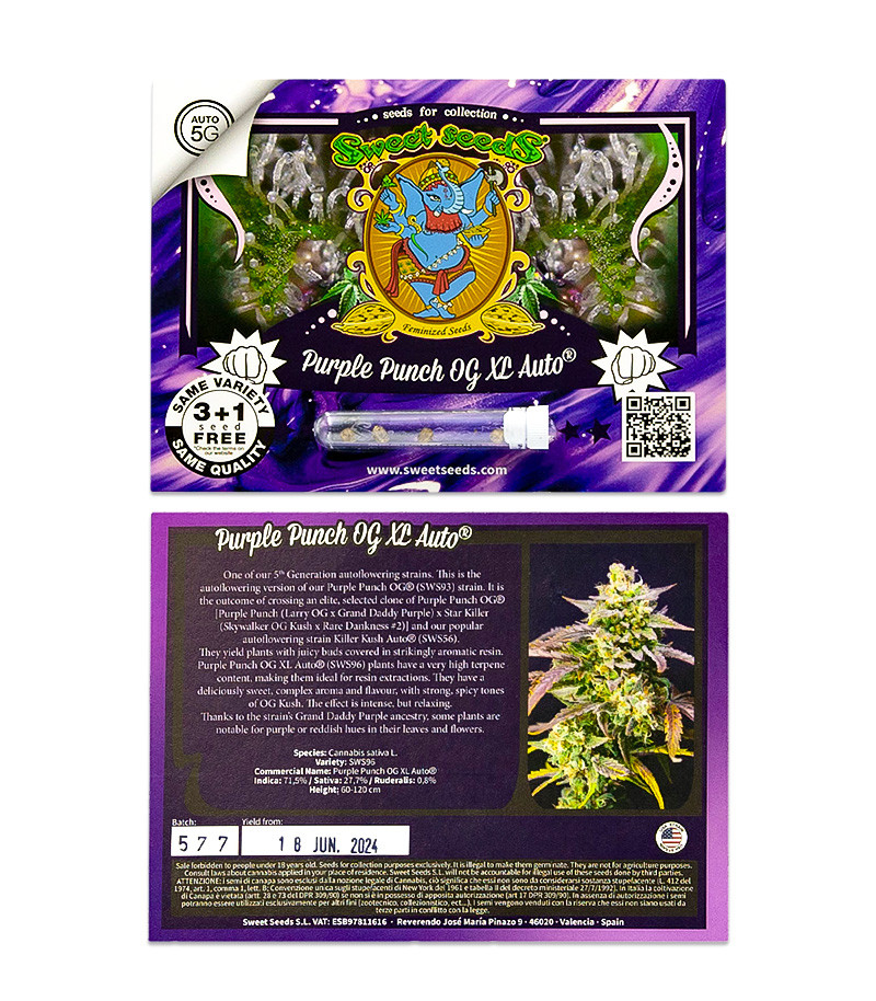 Погрузитесь в мир уникальных свойств вместе с марихуаной Purple Punch OG XL Auto. Этот автоцвет пятого поколения представляет собой воплощение передовых научных достижений в сочетании с лучшими традициями канна-селекции последних пяти десятилетий. С точки зрения генетики рецепт успеха оказался весьма прост. Специалисты выбрали лучший, элитный клон Purple Punch OG (Purple Punch x Star Killer) и скрестили его с близким родственником Killer Kush Auto. Последний помог закрепить ключевые качества растения и придал ему автоцветущие свойства.