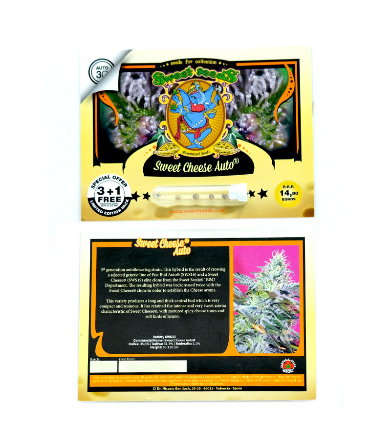 Sweet Cheese Auto ("Сладкий сыр") - автоцветущий гибрид третьего поколения, обладатель очень яркого и насыщенного сладкого аромата Cheese, созревающий за 8 недель от всходов.